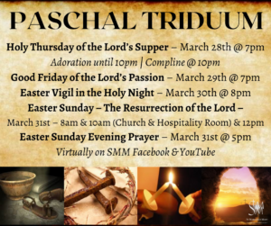 “In Lent the playing of the organ and musical instruments is allowed only in order to support the singing. Exceptions, however, are Laetare Sunday (4th Sunday of Lent), Solemnities, and Feasts.” (GIRM#313) At SMM we will have no instrumental prelude or postlude music, except by the handbells on the 4th Sunday of Lent. If using the organ for Mass music, please reduce the sound throughout the Lenten season.