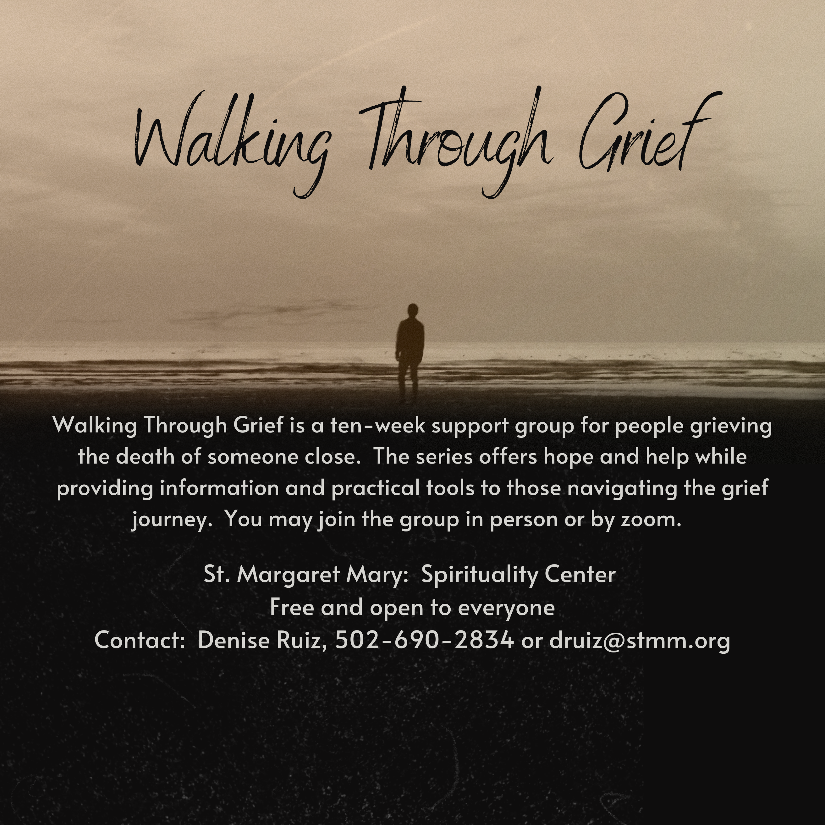 Walking Through Grief is a 13-week support group for people who have experienced a significant loss. The format of the program involves watching a video which gives important information about the grieving process followed by group discussion. You do not have to be an expert on grief and are not expected to have answers for the group. Your job is simply to be a caring person who can create a safe place for people to share their grief. Training includes shadowing a facilitator and mentoring through the process. If you have a calling to help those who are grieving, please contact Denise Ruiz at 690-2834 (desk) or druiz@test.stmm.org